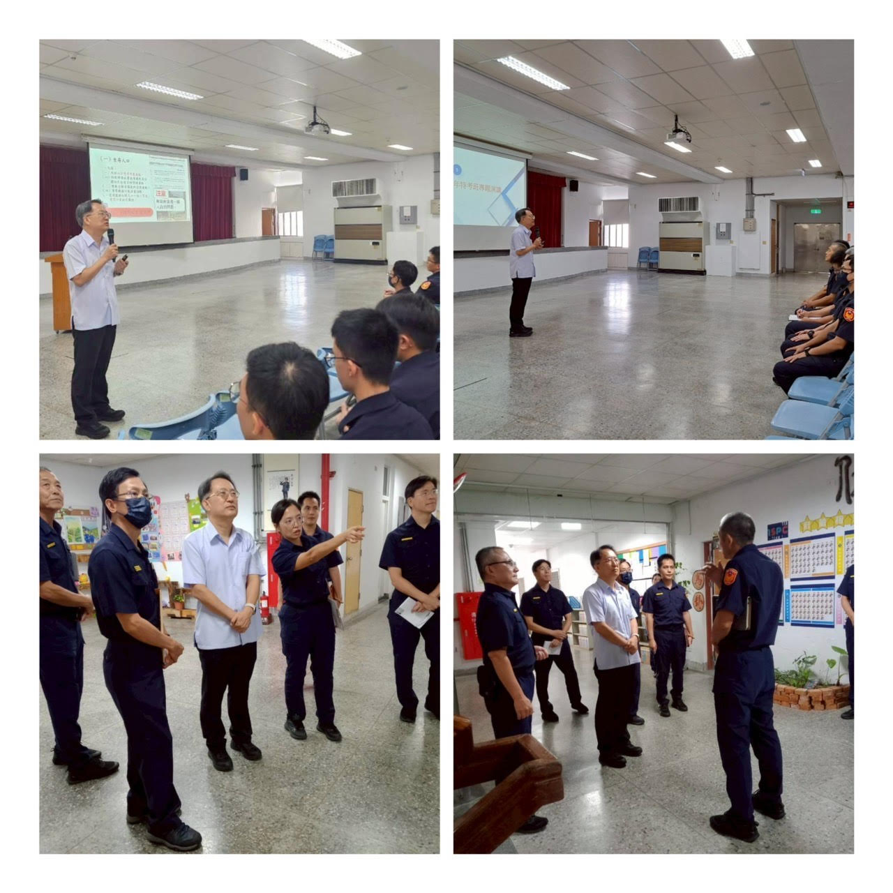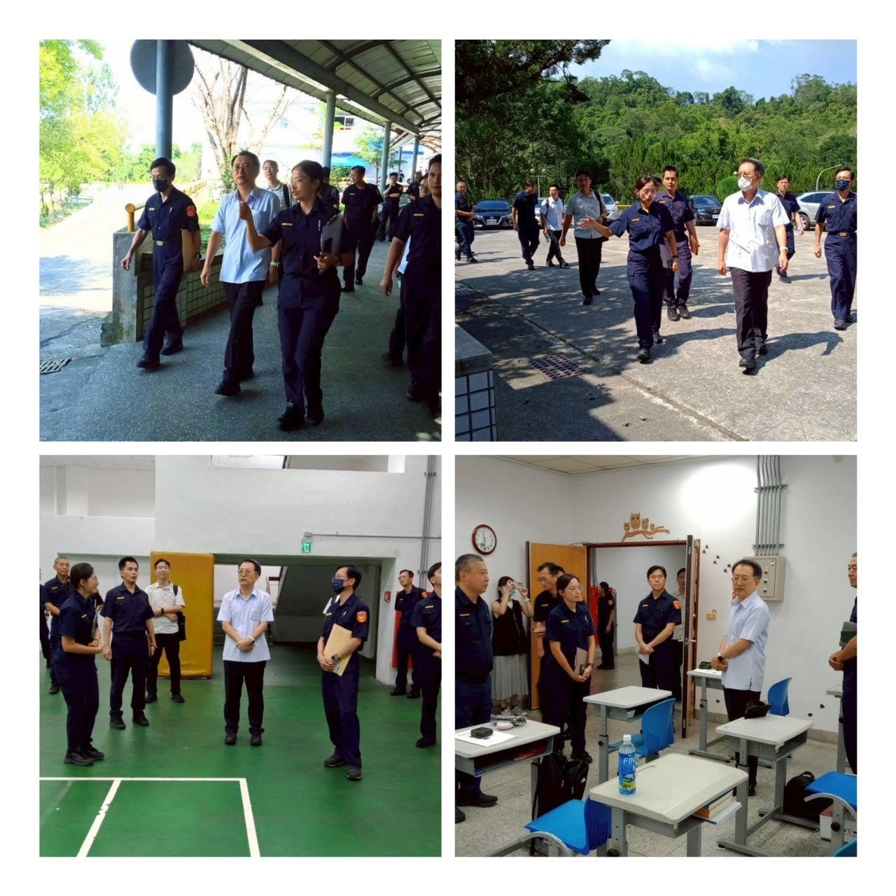 11時30分由李副總隊長、侯督察及職陪同劉校長巡視日新樓2樓學員寢室、日新1樓中庭、教室及教官休息室、並至樂群樓餐廳及地下室籃球場等駐地巡察,過程圓滿平順。