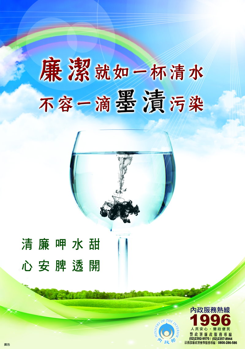 廉潔就如一杯清水 不容一滴墨漬汙染